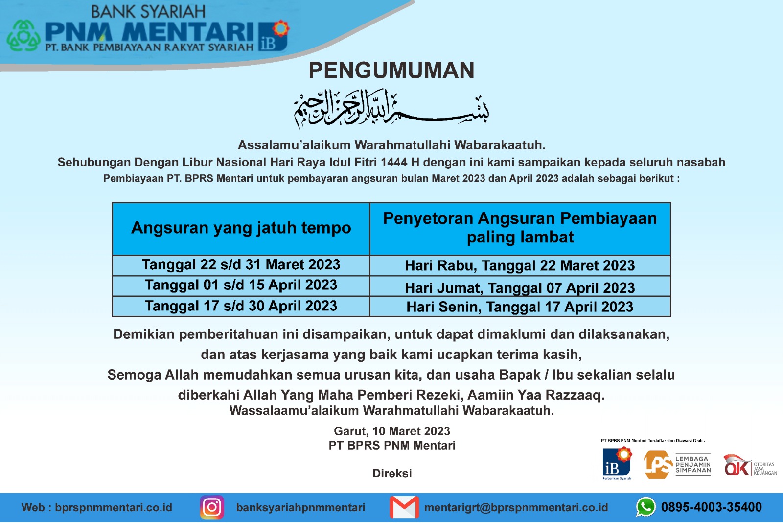Pengumuman pembayaran Angsuran Pembiayaaan Bulan Maret 2023 dan Bulan