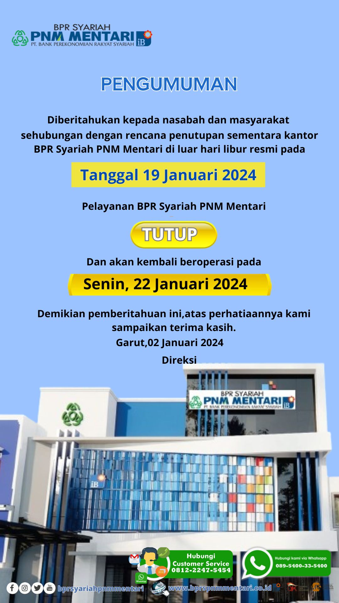 Pengumuman Tutup Sementara Kantor BPRS PNM Mentari Tanggal 19-21