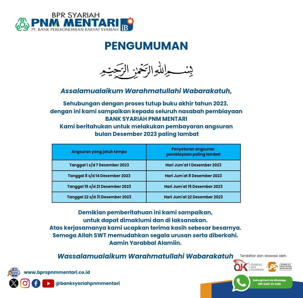 Pengumuman Pembayaran Angsuran Pembiayaan Bulan Desember 2023