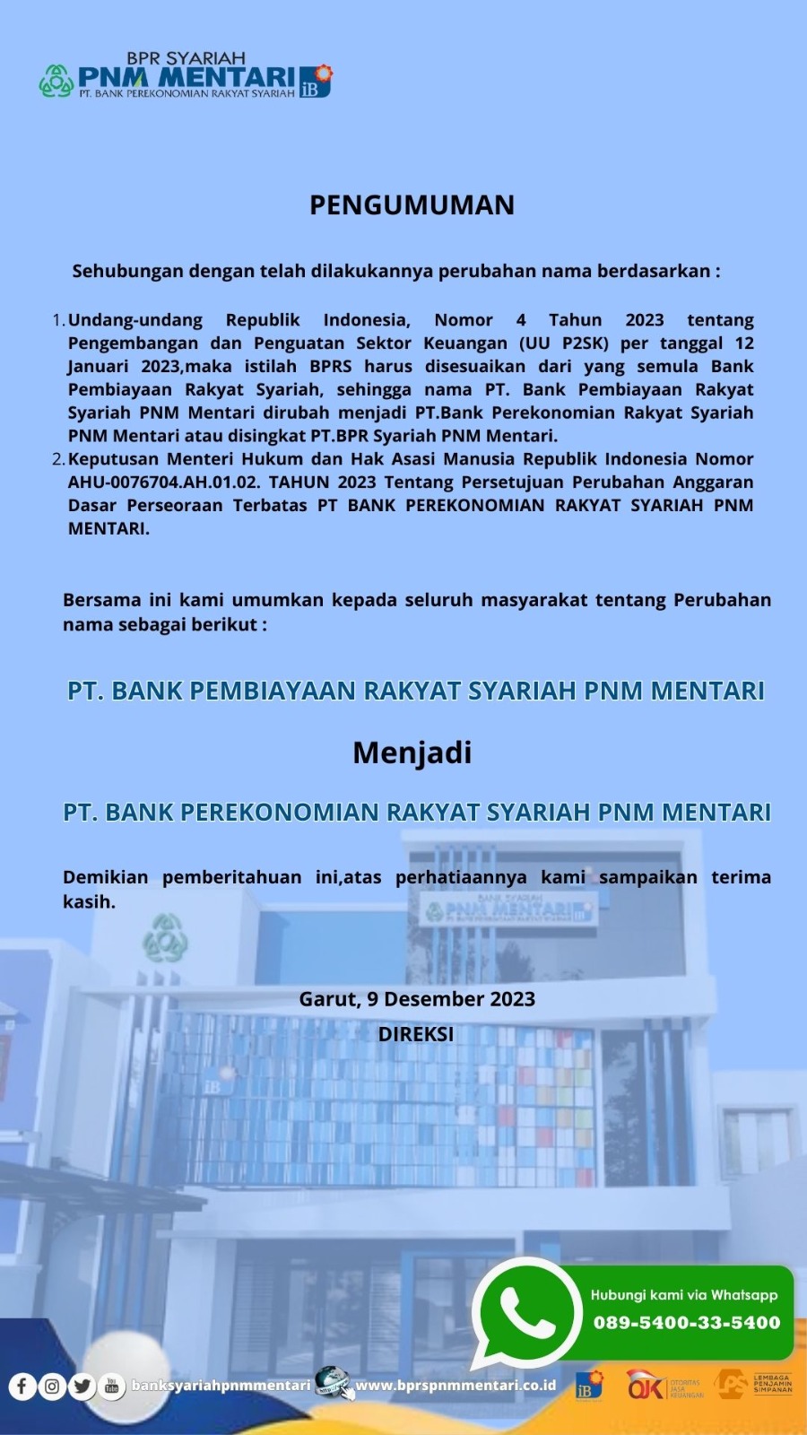 Pengumuman Perubahan Logo BPRS PNM Mentari